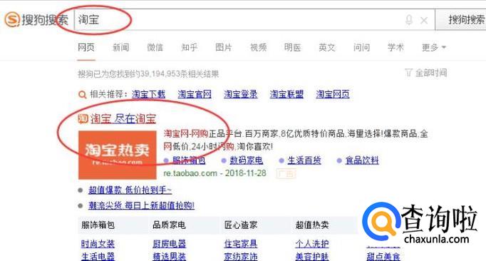 首先在浏览器中搜索【淘宝】,点击第一条链接即可登陆淘宝,如下图所示: