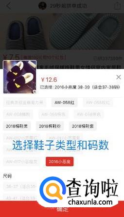 点击“去拼单”以后,点击“参与拼单选项”,然后选择想要购买的鞋子款式和尺码,选好以后点击“确定”。