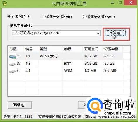 打开桌面上的大白菜pe装机工具,点击“浏览”,将ghost win7系统镜像包添加进来,如下图所示: