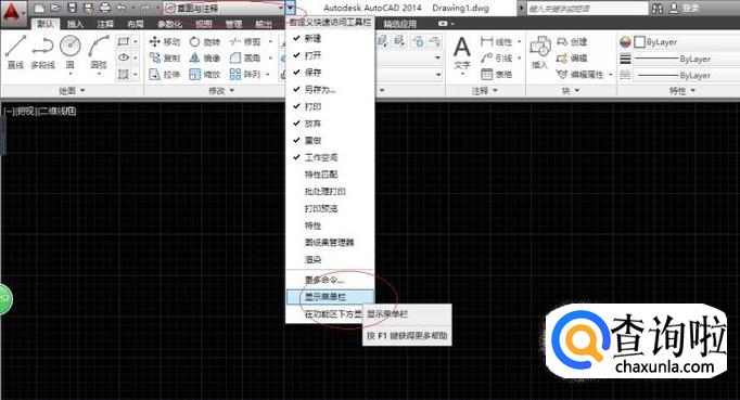 点击"自定义快速访问工具栏"向下箭头,弹出下拉列表选择"显示菜单栏"项。