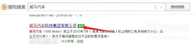 首先我们打开搜狗搜索引擎搜索“威马汽车”,找到官网点击标题进入。