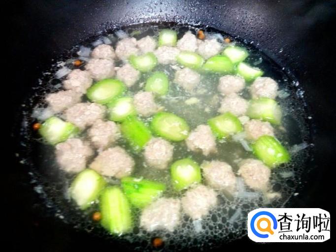 煮至肉丸漂浮水面后,放入丝瓜(用勺子撇一下上面的沫子)。煮至丝瓜变软,放入少许味精,关火。