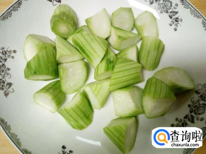 丝瓜去皮,用水清洗干净,控干水分,切成滚刀块。