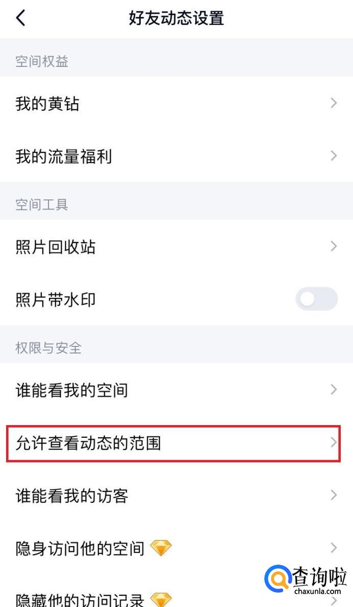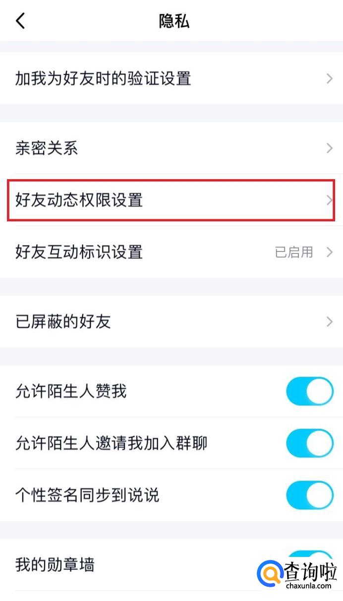 在“隐私”页面中找到“好友动态权限设置”,如下图所示。