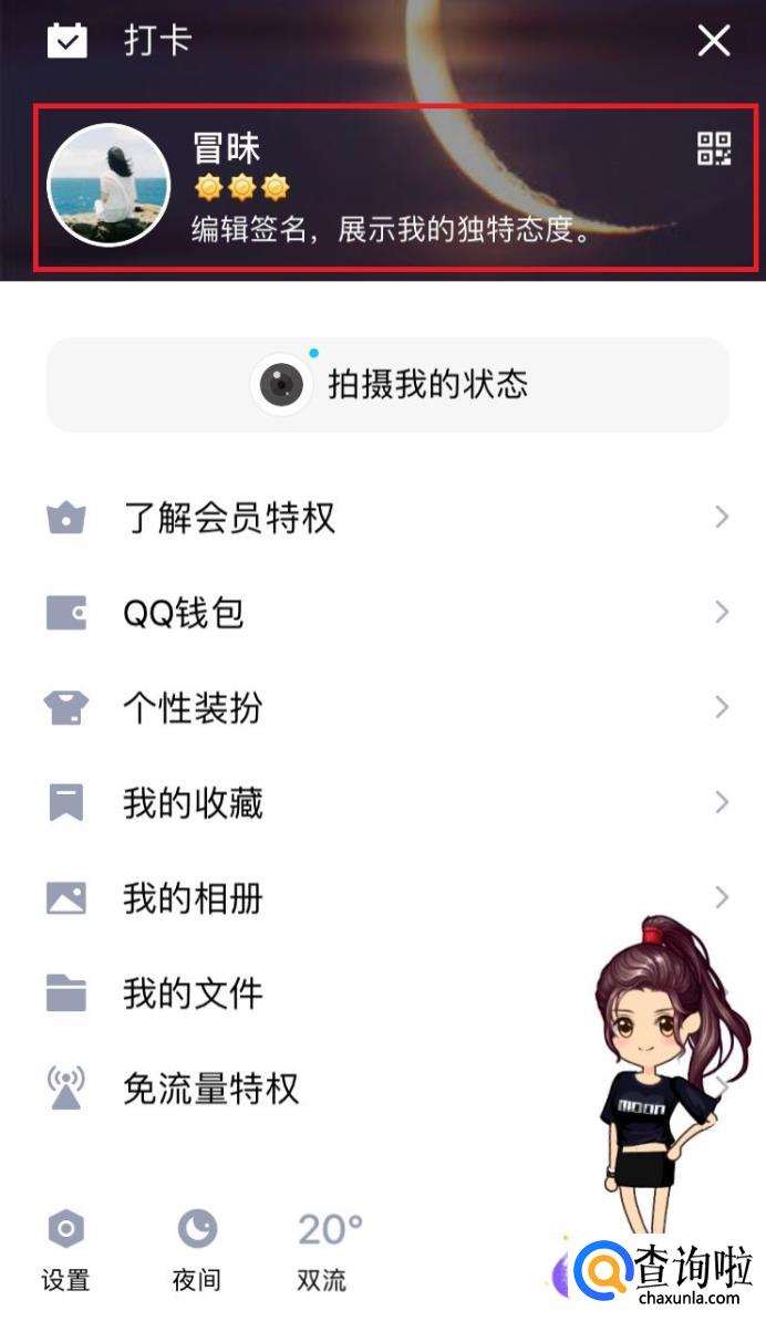 打开手机QQ,点击个人头像进入以下页面,点击网名一栏。