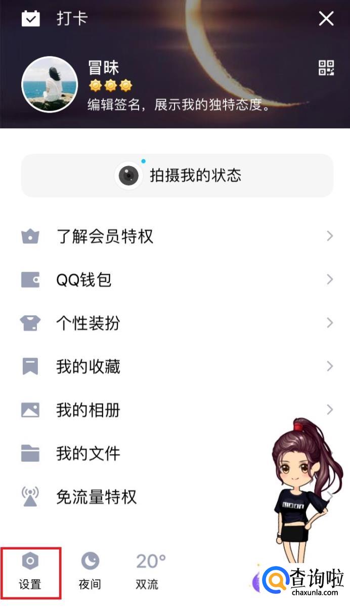或者也可以通过隐藏说说功能,让别人看不到自己说说的内容,也相当于批量删除了QQ,我们打开个人页面,找到左下角“设置”功能。