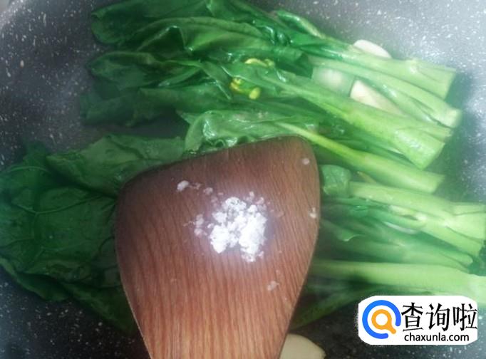 开火下油,放蒜米进去爆出味来,然后芥兰下锅,加适量的盐。