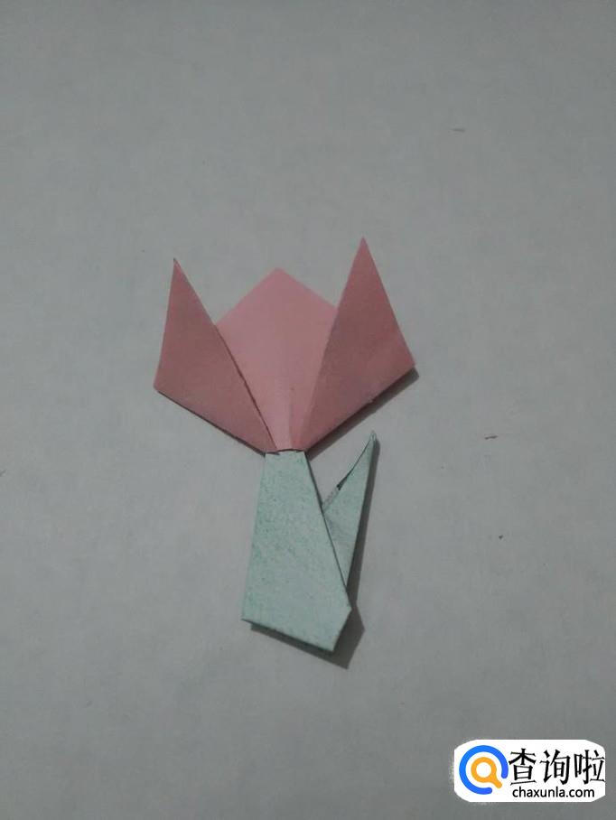 把叶子的尖部插入花朵下面的小孔中,一朵漂亮的郁金香花就折好了。