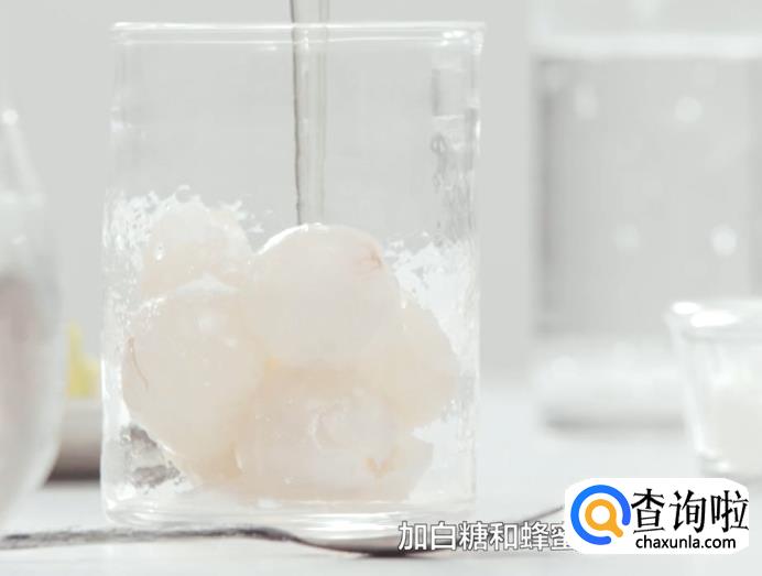 将荔枝肉放在容器里,加入白糖和蜂蜜泡一会儿。