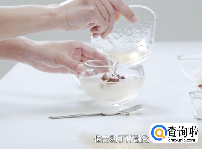 将吉利丁片融化后倒入玫瑰花水里。