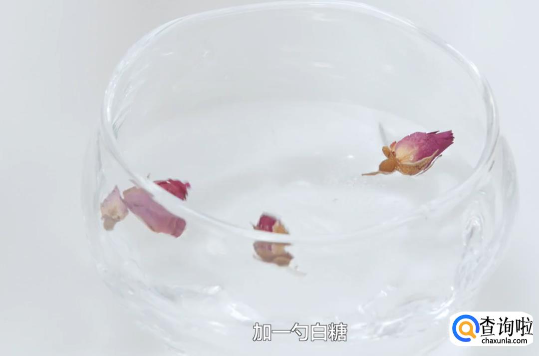 将玫瑰花瓣浸泡在容器里,加一勺白糖搅拌。