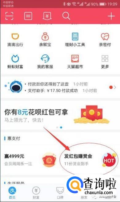 打开手机支付宝,点击下图红色箭头所指的"发红包赚赏金"链接(如果没有的话,直接去搜索栏搜索:发红包 即可