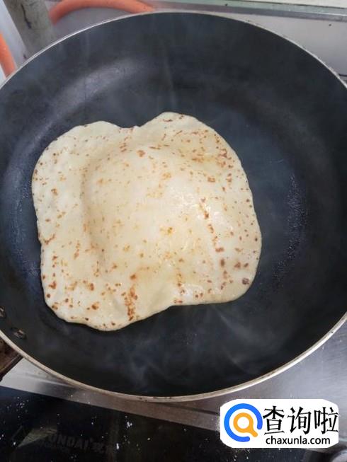 收口朝下,擀圆,电饼铛打开电源,只开下火,将饼放入10秒钟后翻面;