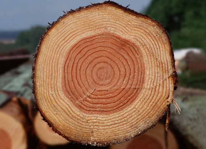 年轮由形成层每年的活动而产生。春天,气候温和、雨量充沛,对树木的生长有利,这是形成层细胞分裂旺盛,新产生的细胞大而明显,导管又大又多,因此,木材就显得颜色淡,质地松软。入夏以后,随着气温增高,雨量减少,而别是到秋天,天气渐冷,雨量更少,形成层活动减弱,分裂出的细胞形状小,加上细胞壁厚,导管又少,木材显得致密而坚硬,颜色也深。
