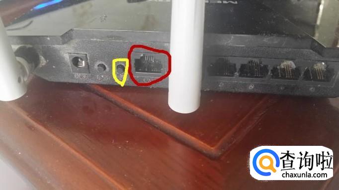 在看路由器的接口。红圈所示得是WAN口,右边的四个是LAN口。需要注意的是黄圈所示的是重启按钮,没事不要动它。