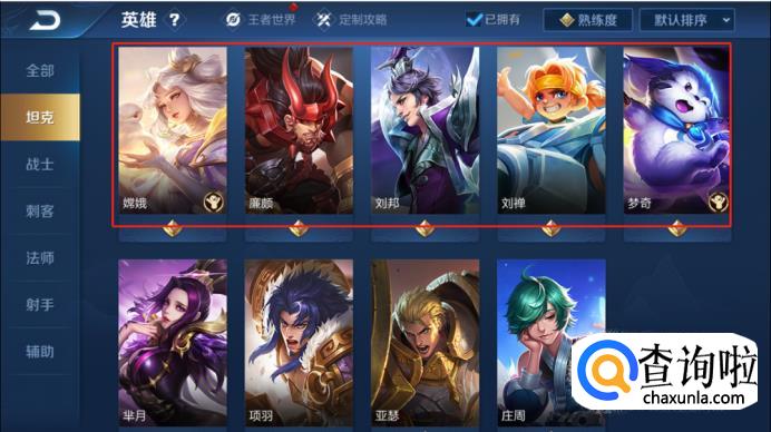 进去英雄界面之后,默认是进去全部英雄的界面。在这里需要知道什么是本命英雄?简单来说,本命英雄就是指最适合你的英雄,一句话,你玩起来最顺手的英雄就是你的本命英雄。这里可以首先来根据个人习惯来判断,如果喜欢用肉,可以确定嫦娥,刘邦,刘禅等为自己的本命英雄,如下图所示: