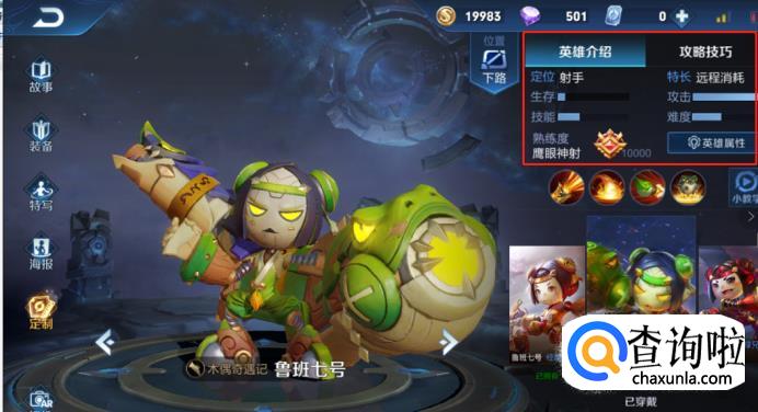 点击战力力最高的英雄进去,可以看到英雄的熟练度一般也是最高的,说明我们平时比较喜欢用这个英雄。当我们根据自己的习惯、战斗力等选好了英雄,点击英雄进入。会有关于英雄的详细介绍。