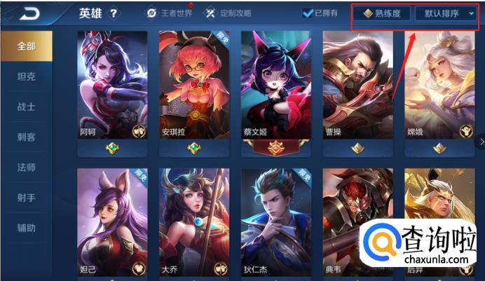 我们除了个人习惯和性格契合之外,还有很关键一点就是英雄的强弱,毕竟打游戏就是说要赢呀。点击全部英雄,右上角有关于英雄的排序,一般英雄的排列是默认的。点击默认将排序改为荣耀战力排序,这样就可以根据战斗力来选择英雄了。