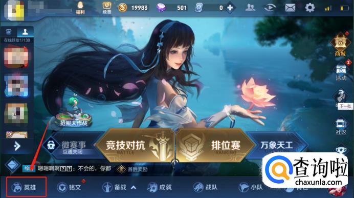 进去游戏主界面之后,会看到左下角有一个英雄,点击英雄。如下图所示: