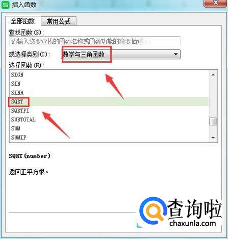 点击其他函数选项在弹出的对话框内选择函数的类别为数学与三角函数,然后在函数里选择开方函数,如图所示:
