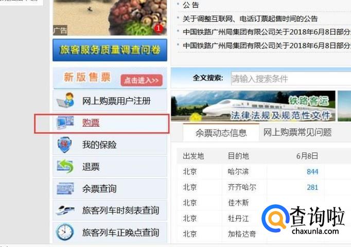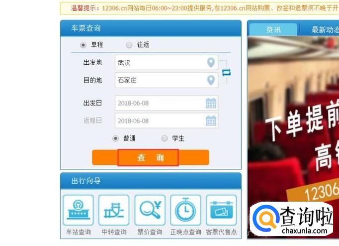 接下来,在打开的购票页面中,选择出发地、目的地车站和乘车日期,并点击“查询”按钮。