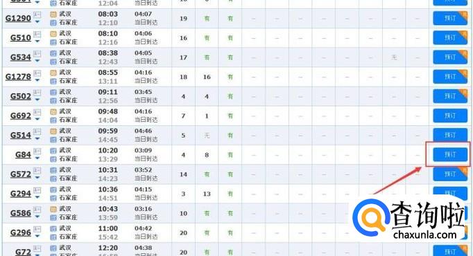 接下来,在打开的车票查询页面中,选择要购买车票的车次,并点击“预定”按钮。