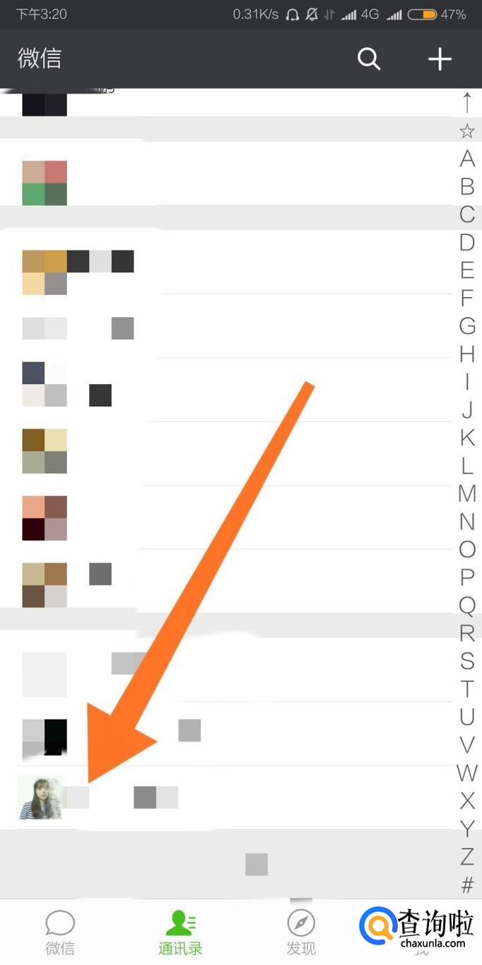 如果需要删除某个微信联系人,首先进入微信“通讯录”页面,点击需要删除的联系人头像。