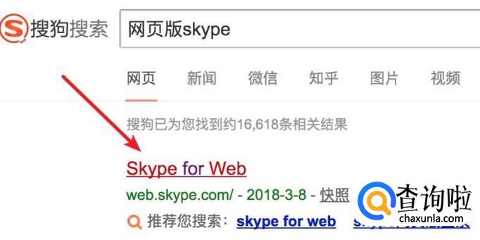 打开搜狗搜索,输入‘网页版skype’搜索,点击打开搜索结果中的第一个。