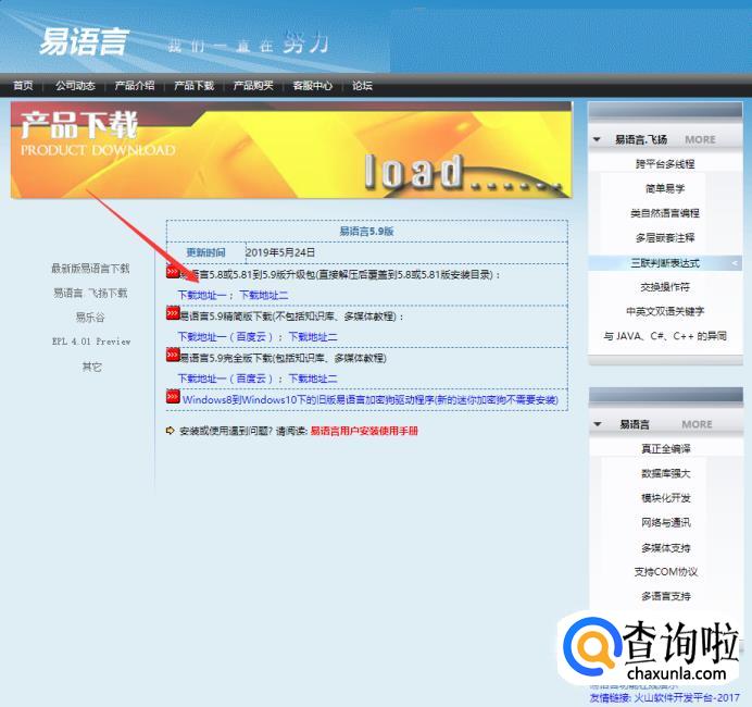 进入到易语言官方网站之后,点击产品下载。