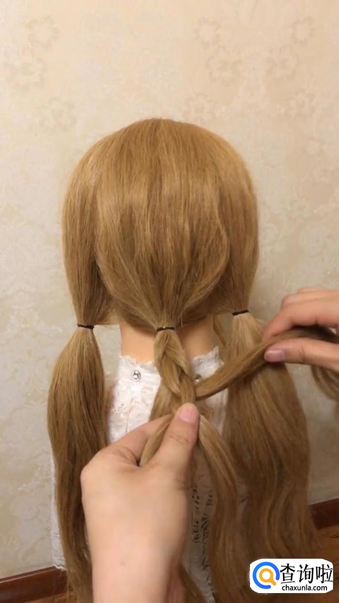 将四份头发取三留一,依次变换留下来的一缕,把头发编成圆滚状的三股辫。
