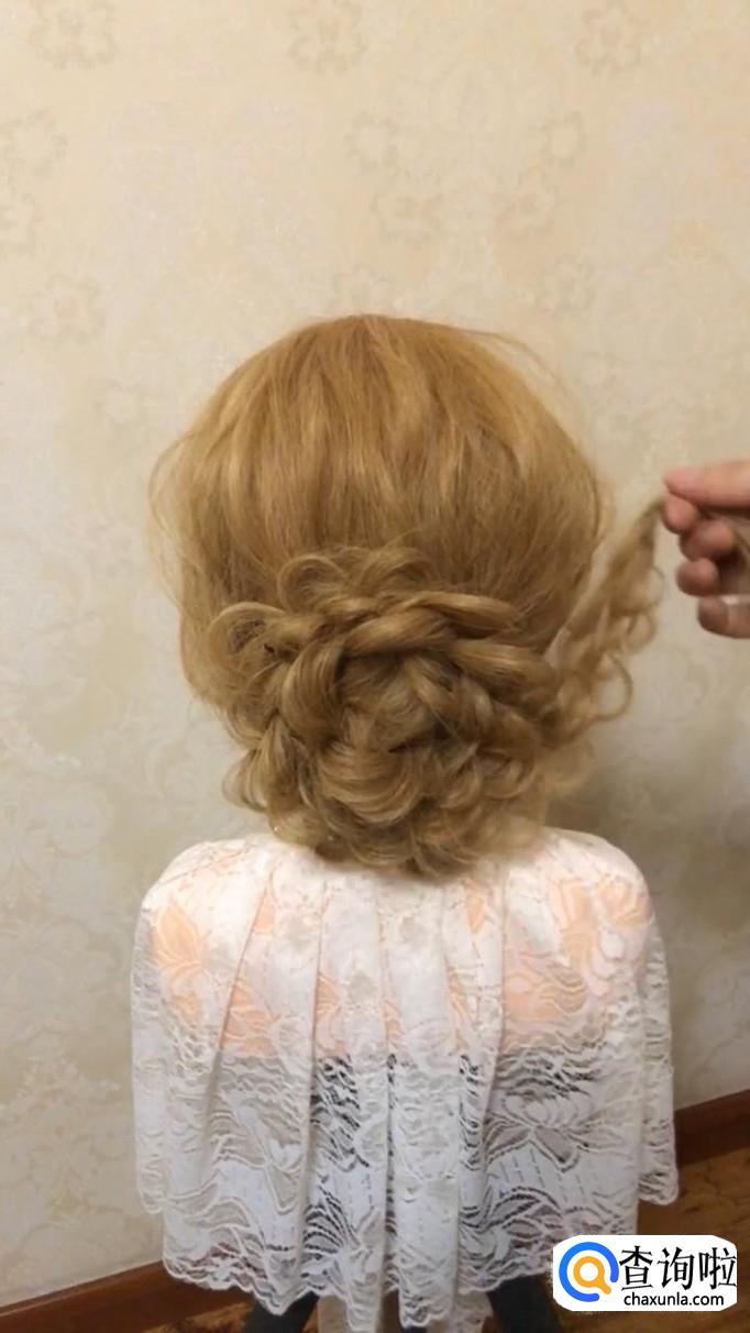 再取出右侧的辫子,同样的操作,辫成三股辫后,缠绕在之前编好的头发上。