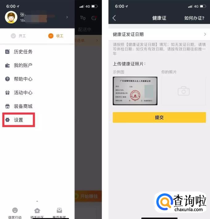 最后,在设置里面,点击健康证,填写健康证发证日期,上传您的健康证照片。