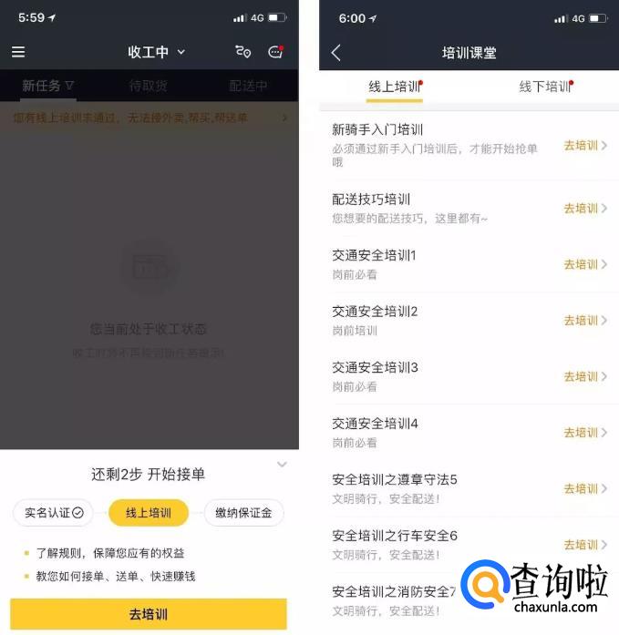 实名注册后,手机应用App内会有一系列的培训指导,告诉您如何接单,如何送餐,完成每个培训后都有相应的在线测试(测试题目非常简单,助您快速熟悉App);