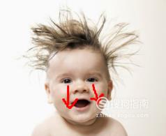 如下图的宝宝,耸起鼻子。然后用两手的食指和中指,从红点开始,压紧,用大约6秒的时间,沿着红色箭头方向向下一直推到嘴唇上方。重复6次。