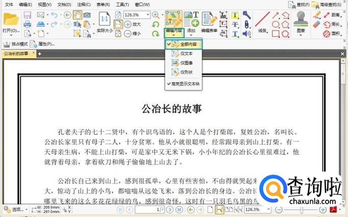 用工具将pdf文件打开后,我们点击编辑内容按钮中被蓝线框住的部分,在弹出的选项中选择全部内容。