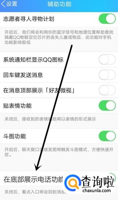 进入辅助功能页面,该页面最下边的“在底部展示电话功能”开关打开即可,如图所示。