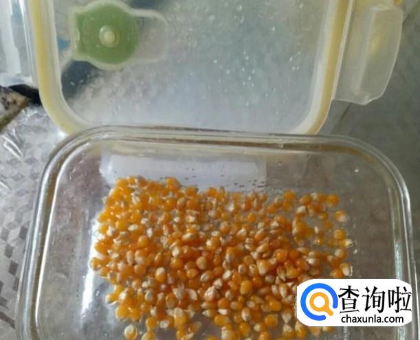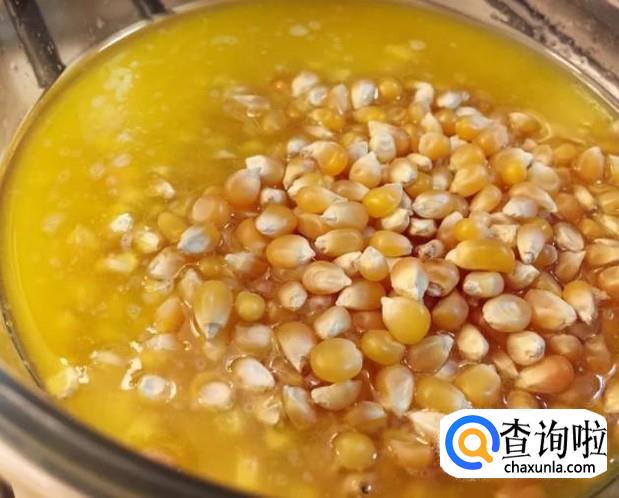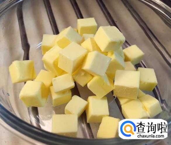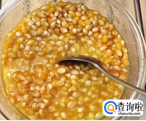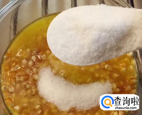 黄油切块,放微波炉加热融化,将玉米粒加入融化的黄油中