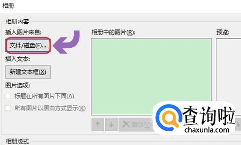 点击相册以后会弹出一个对话框,我们选择该对话框左上角的“文件/磁盘”,这样即可添加电脑本地的相册了,如图二所示;