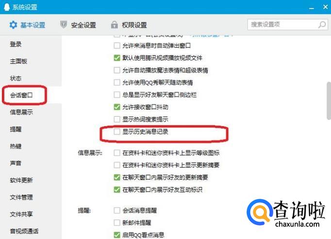 在“会话窗口”里面,我们看到有“显示历史消息记录”选项,我们把它勾选上就可以了。再次登录QQ,就可以查看聊天记录了。