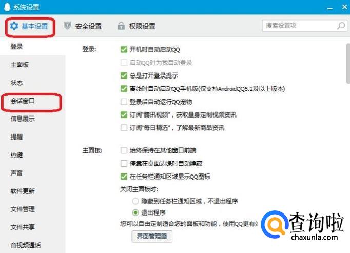 如图所示,就进入了QQ的系统设置界面,我们点击“基本设置”里面的“会话窗口”按钮。