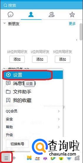 进入QQ的主界面,如图所示,点击主界面左下角图标,在弹出菜单中选择“设置”。