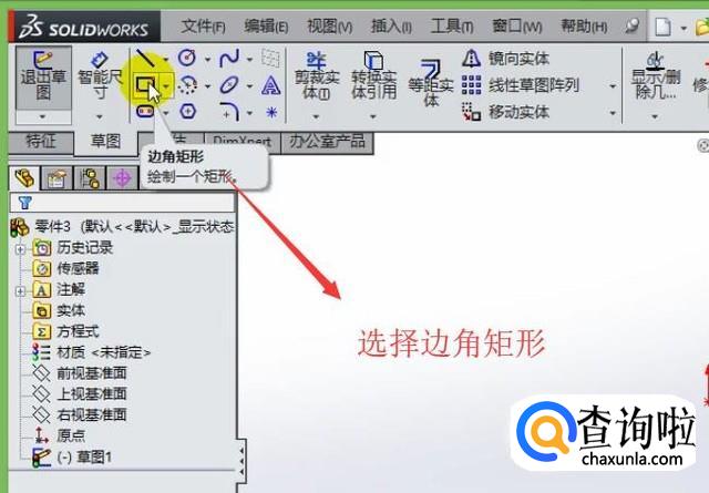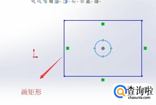 接下来我们运用边角矩形工具在SolidWorks主界面绘制一个矩形,如下图所示,注意要绘制正面视图