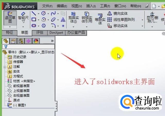 接下来会进入到SolidWorks主界面,下面将会在这个界面进行平面图形的绘制以及拉伸,如下图所示