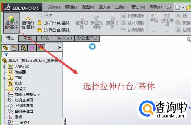 接着我们看到左上角的菜单栏已经出现了拉伸凸台/基体菜单,我们点击它,如下图所示