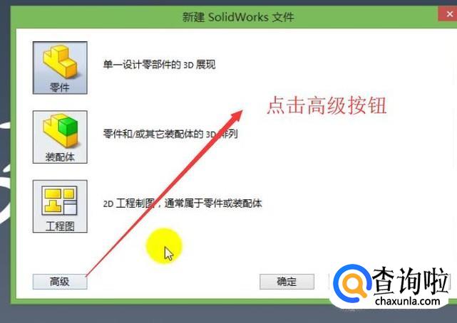 接下来在弹出的新建SolidWorks文件界面中点击左下角的高级按钮,如下图所示