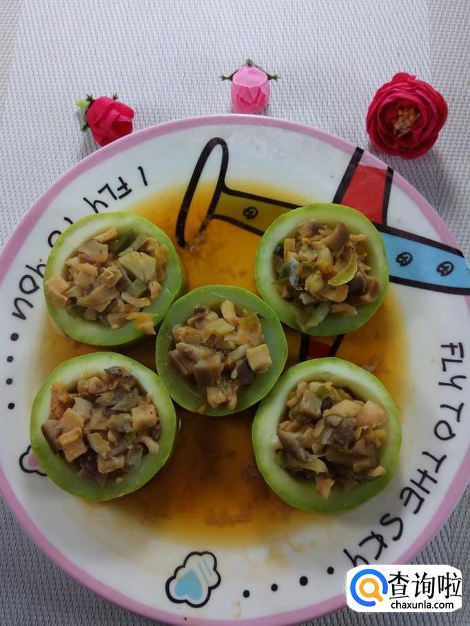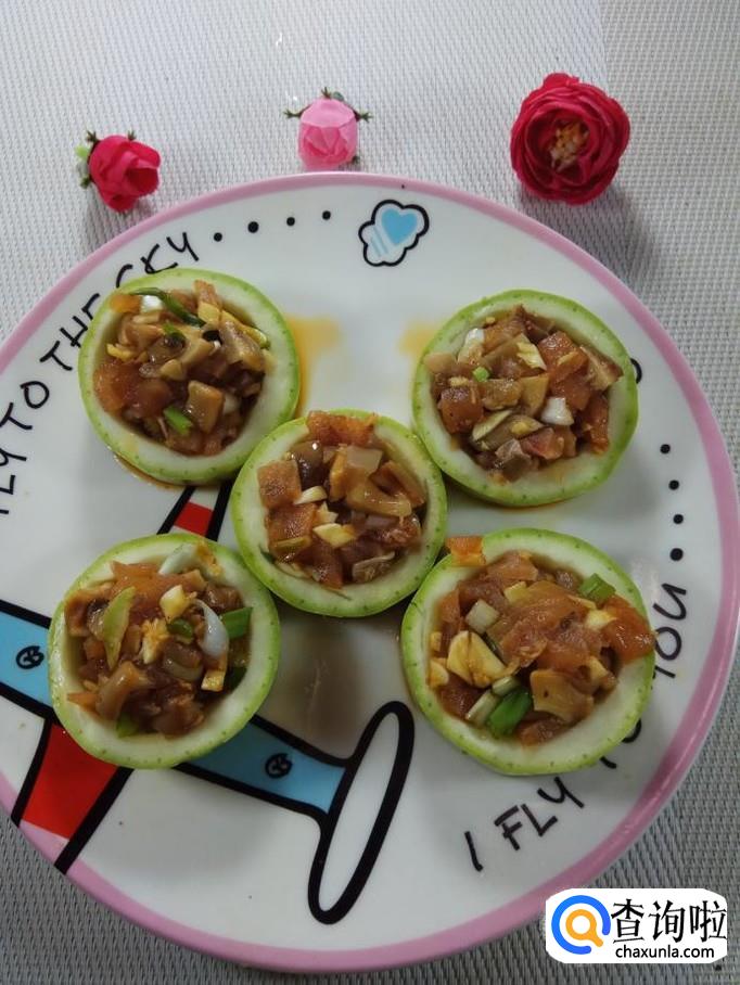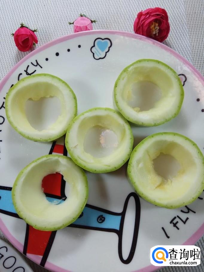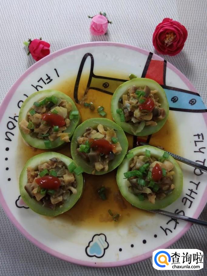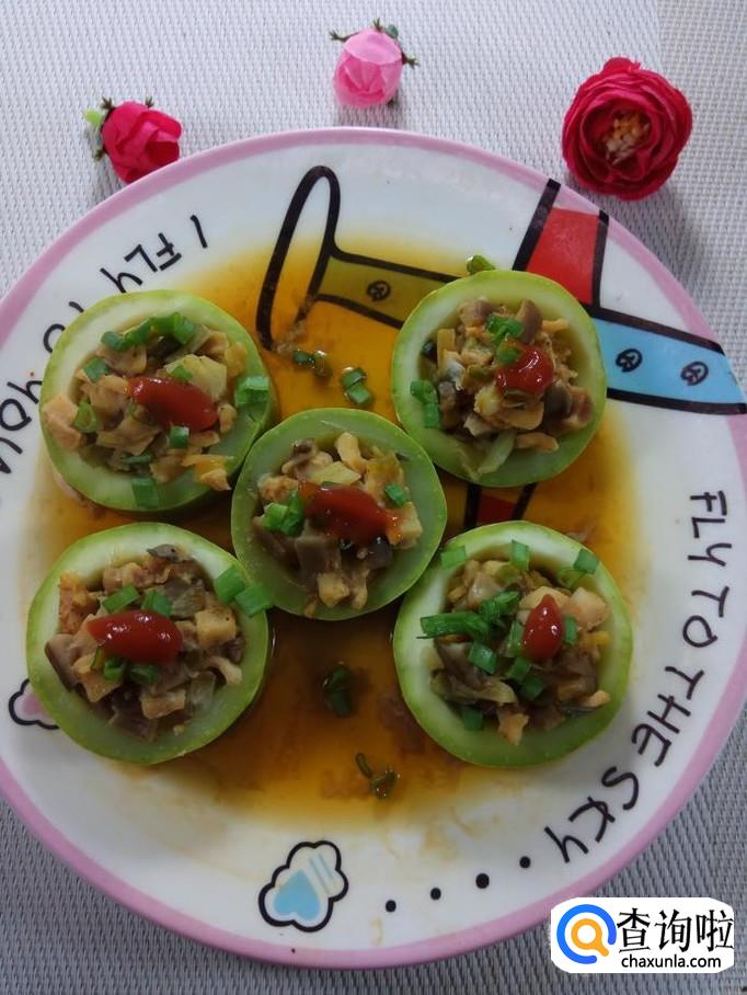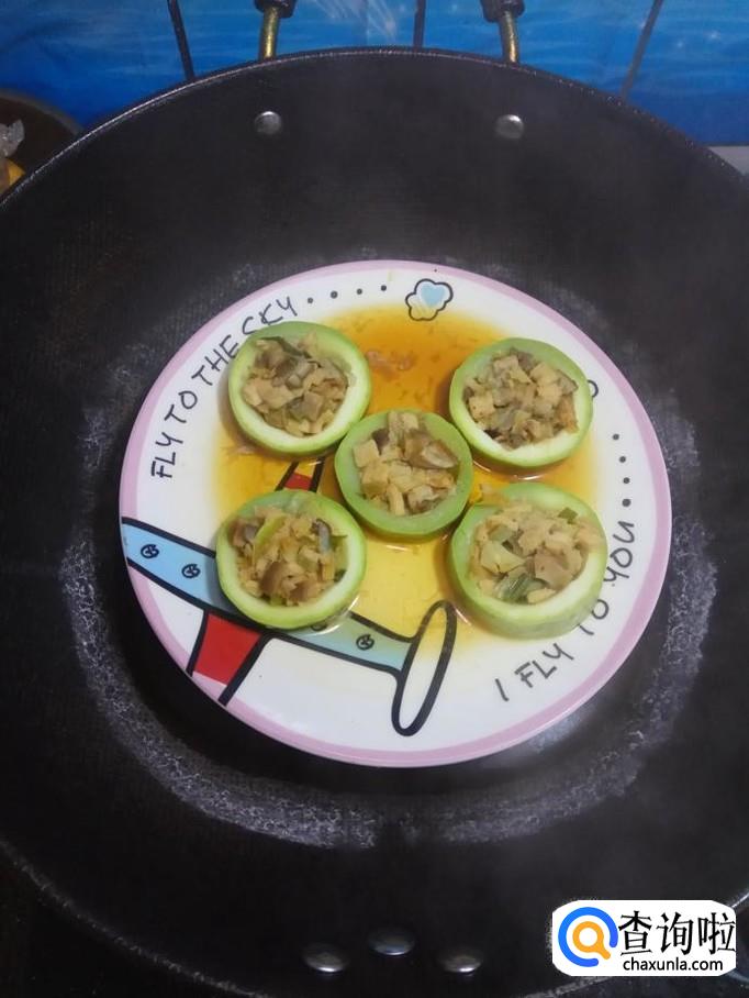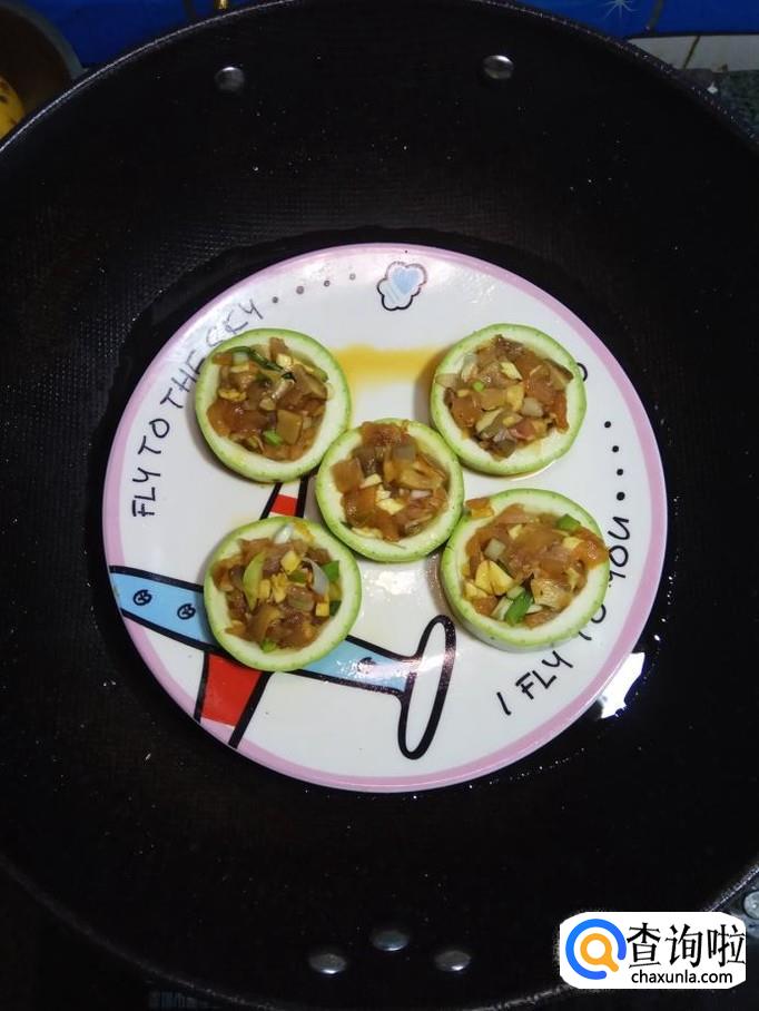 将做好的馅放入西葫芦的圈中,用勺子压实。