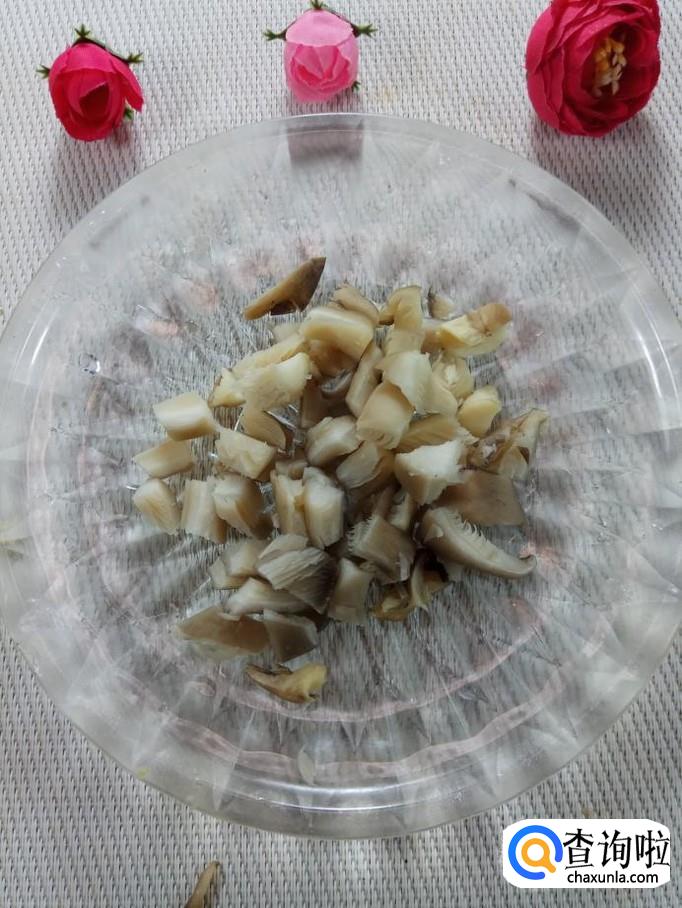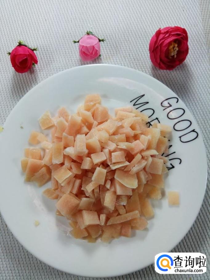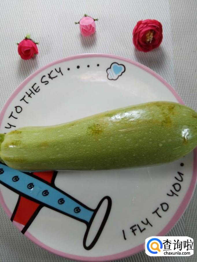 将西葫芦切成圈,然后掏去内瓤备用;将蘑菇切成小丁儿,鸡胸肉也切成小丁,放入盘中备用。