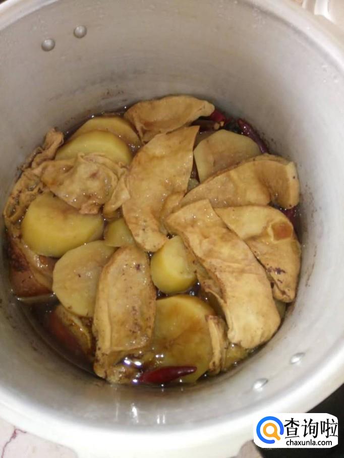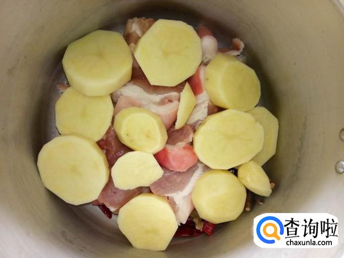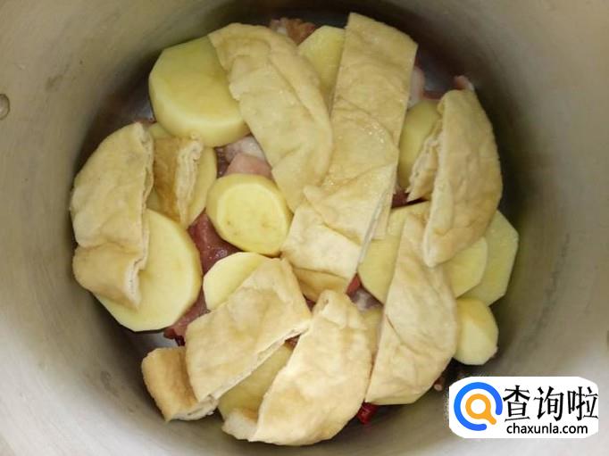 将土豆摆放在五花肉上面,将油豆腐摆放在土豆上面;这样放是土豆相对油豆腐更不容易熟,而土豆和油豆腐放在上面,浸的汁液少一点,不会太咸了;