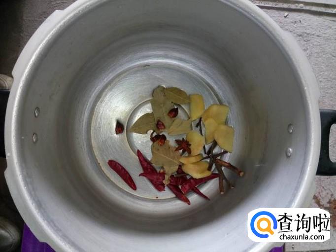 取一块姜,将姜去皮后洗净,切成片状;这时候,姜可以切成偏厚一点;取几个八角、桂枝、香叶、干红辣椒洗净备用;