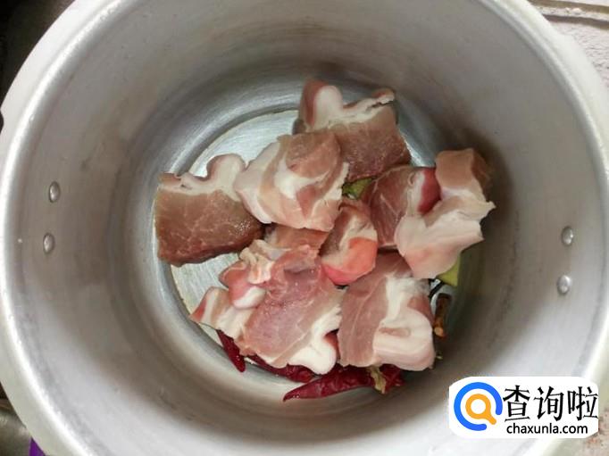 将锅洗净,然后八角、桂皮、香叶、干红辣椒先放入锅底,再将五花肉放上去;这样能让香药更出味,五花肉也更容易熟;